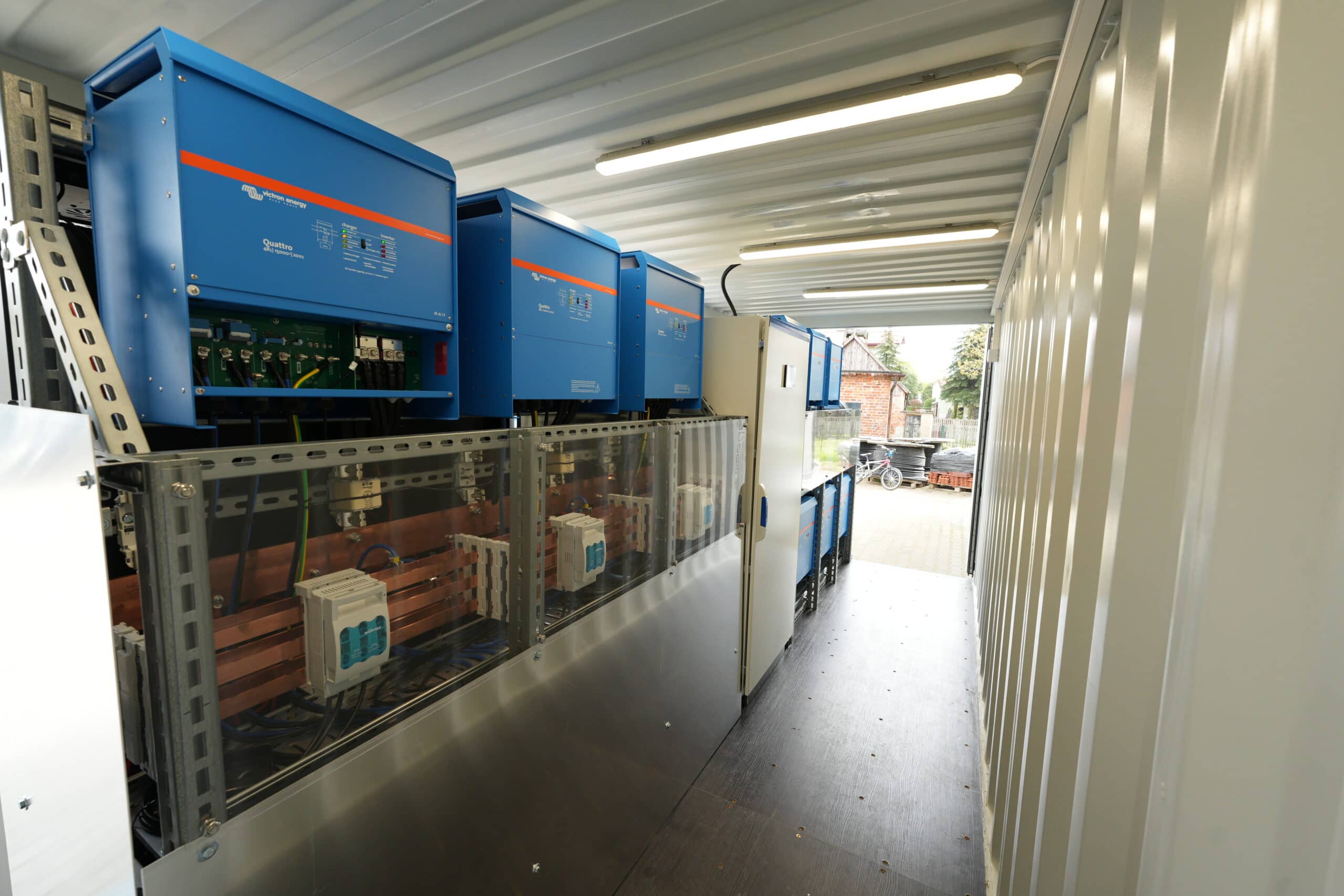 Enerp have built a 20 foot open door energy container for customer demonstration and for use at public exhibitions. Its 3-phase AC output is provided by 6 x Quattro 15 kVA Inverter/Chargers drawing from a 200 kWh Pylontech US5000 battery bank. Visitors will see an EV plugged into a Victron EV charging station NS. The unit is capable of running huge loads and offers both AC and DC distribution.