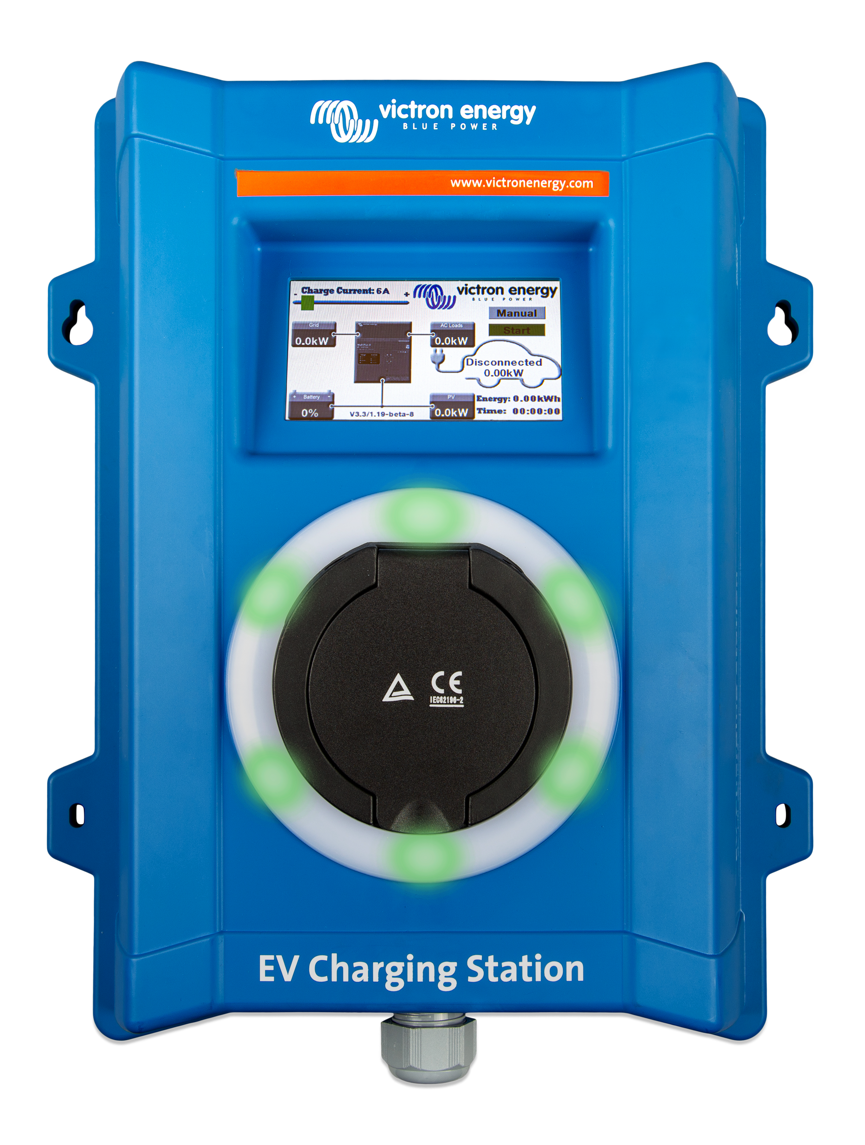 Αυτός ο Σταθμός Φόρτισης EV όχι μόνο συνεργάζεται πλήρως με μια συσκευή Victron Energy GX και την πύλη VRM, αλλά αν έχετε ηλιακή εγκατάσταση (εντός του οικοσυστήματος Victron), μπορεί επίσης να διαμορφωθεί ώστε να επιτρέπει την απευθείας φόρτιση του οχήματός σας από την πλεονάζουσα ενέργεια από τον ήλιο. Η χειροκίνητη λειτουργία και η προγραμματισμένη λειτουργία προσφέρουν ακόμα μεγαλύτερη ευελιξία για να ανταποκρίνεται ο σταθμός στις ανάγκες του Ηλεκτρικού οχήματος ανάλογα με το σύστημα.