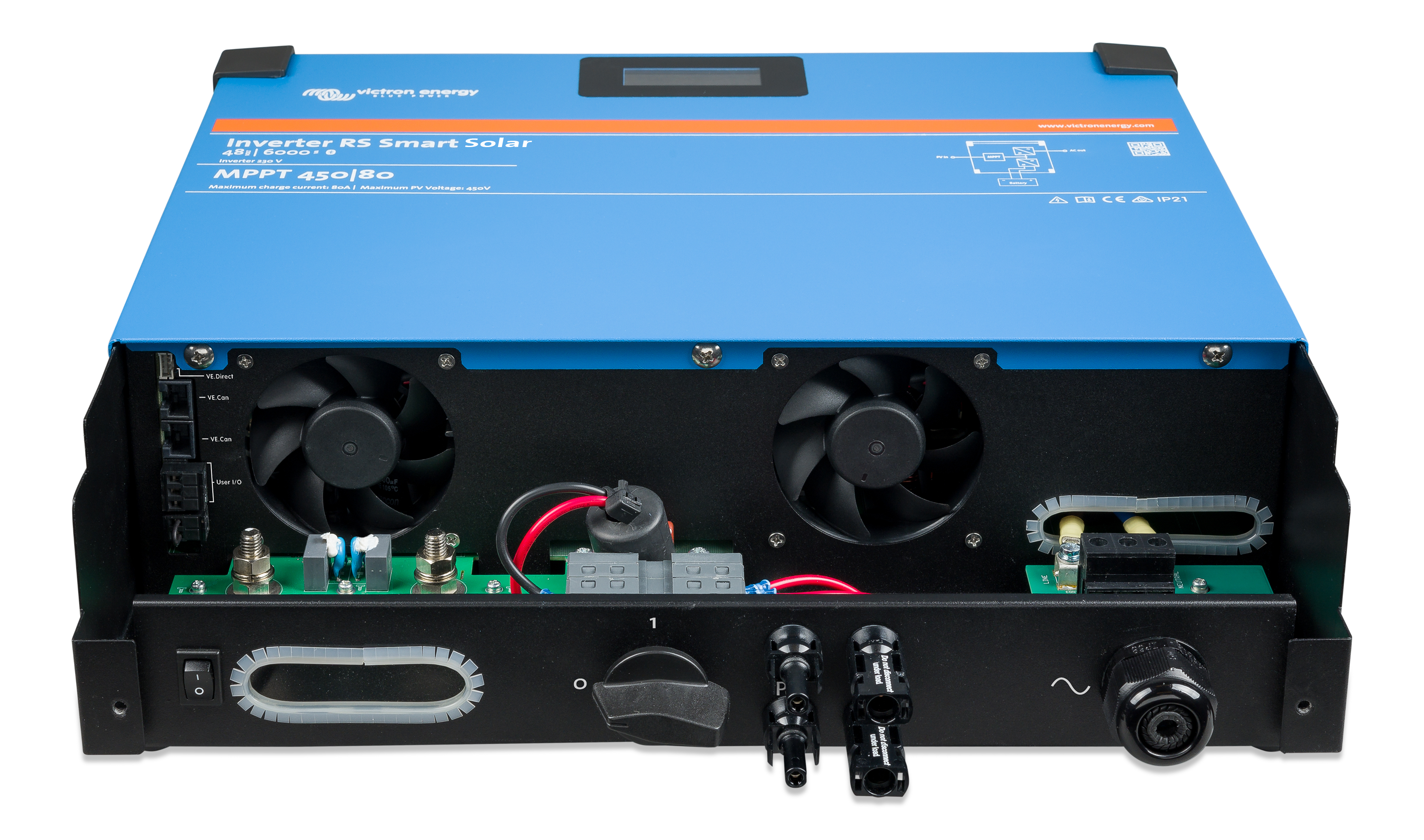 Ο μετατροπέας RS Smart Solar είναι ένας συνδυασμός ενός ισχυρού μετατροπέα 48VDC, 6kVA 230VAC και ενός ηλιακού φορτιστή υψηλής τάσης, 80-450VDC, 4kW MPPT. Χάρη στο μοντέρνο σχεδιασμό και την τεχνολογία υψηλής συχνότητας, ο μετατροπέας ζυγίζει μόνο 11 κιλά και έχει εξαιρετική απόδοση, χαμηλή ισχύ αναμονής και πολύ αθόρυβη λειτουργία.